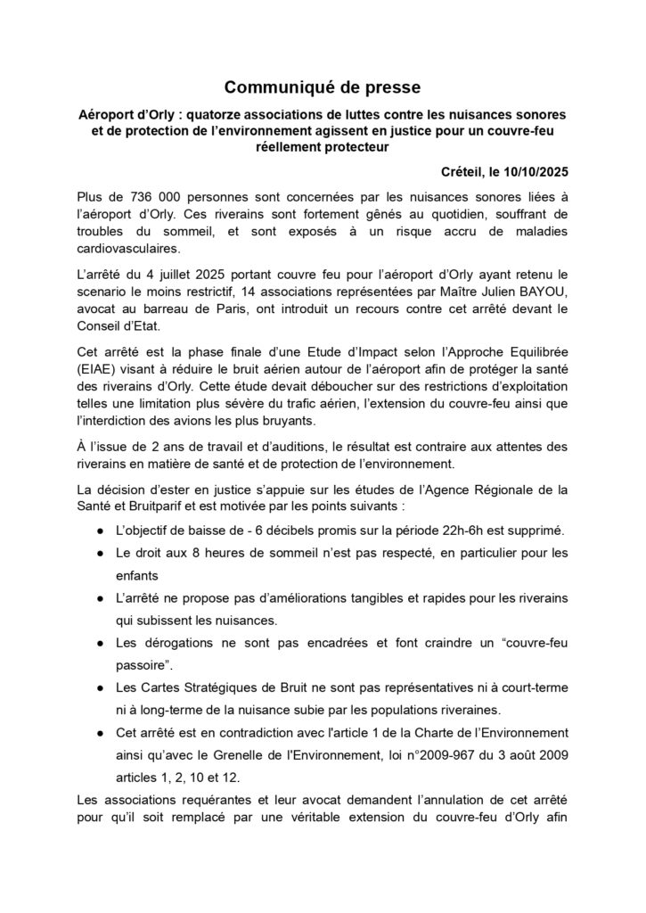 Aéroport d’Orly : quatorze associations de luttes contre les nuisances sonores et de protection de l’environnement agissent en justice pour un couvre-feu réellement protecteur